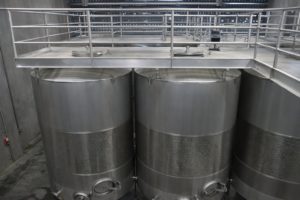 The building is stunning yet at the same time a humble testament to Christian’s desire to build a winery that that does not visually conflict with the natural beauty of the land. The exterior walls, called Gabions are essentially galvanized steel cages containing natural rock. This basalt rock was mined from nearby American Canyon and sits loosely in the cages providing protection from the heat of the summer as well as allowing natural light to shine through during the day. The smaller stones re located on the lower reaches of the walls (as the lower interior space requires more insulation). Both barrel rooms, main tank facility and offices are contained within its walls. The building was completed in 1997.