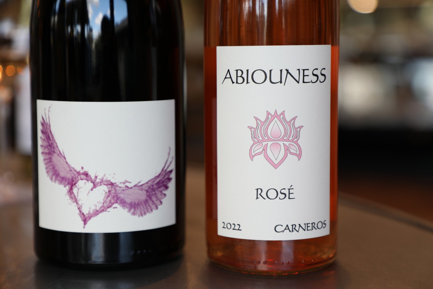 The 2022 Abiouness Ten Rows Pinot Carneros, Napa Valley; this wine is pale ruby in color. The bouquet offers more fruit characteristics than spicy notes that this variety sometimes expresses. It offers scents of dried rose petals, raspberries, red cherries and currant. Bright and elegant, it reveals flavors of raspberry, blueberry, cherry, currant and cranberry. This is not a spicy palate, rather like the bouquet, its focus is on the fruit. We immediately noted its balanced profile with a freshness and lingering brightness. The finish persists with a light presence of tannins and a hint of dried sage. This is an easy and comfortable drinking Pinot Noir. Crack open a bottle of this after work, any day of the week. The bamboo drawing as the label is changed every year. The name Ten Rows, is in homage to the first grapes she sourced for Pinot Noir from Stanly Ranch. And this has been in by the glass programs in numerous Napa Valley restaurants.