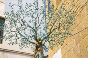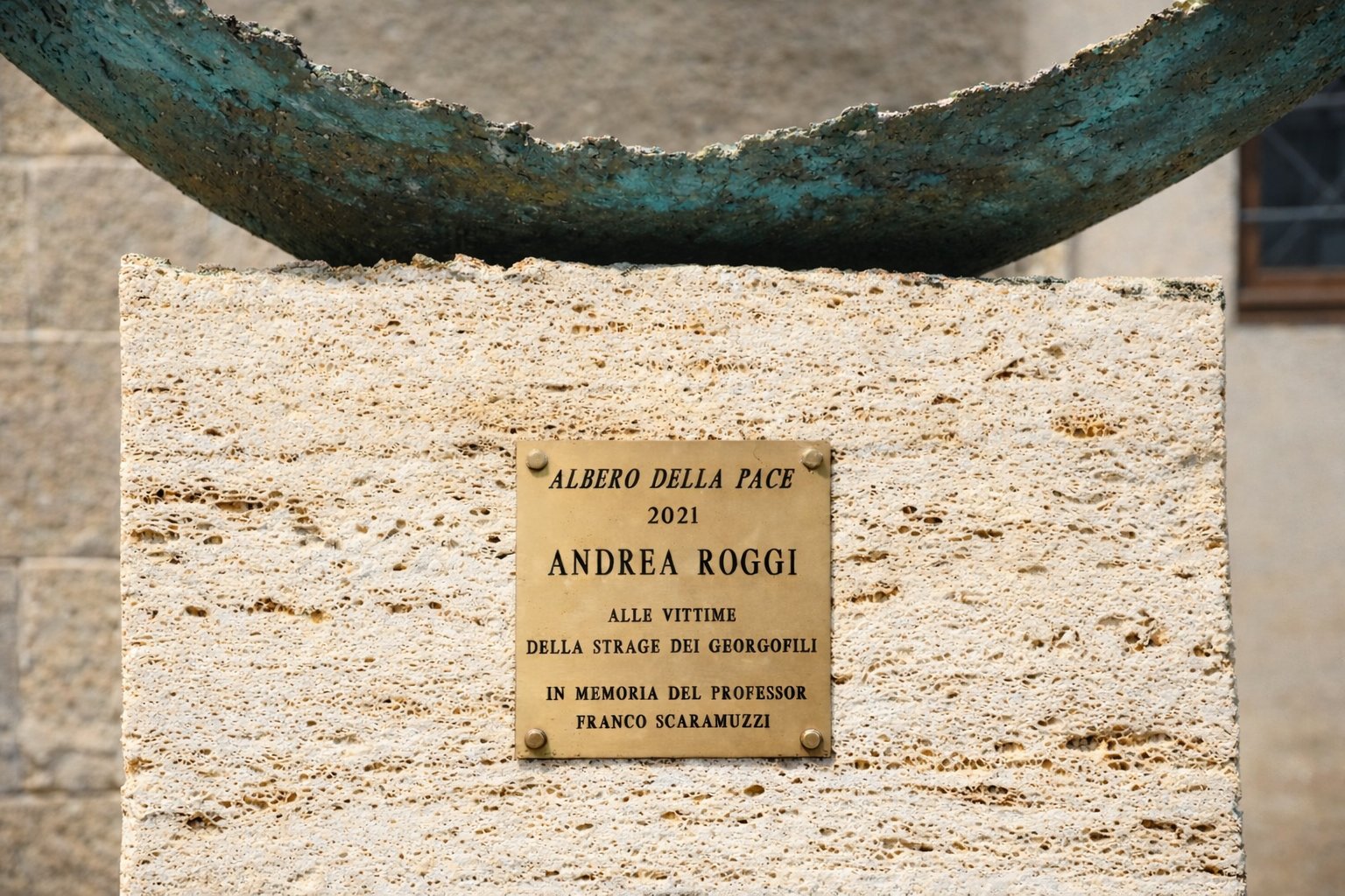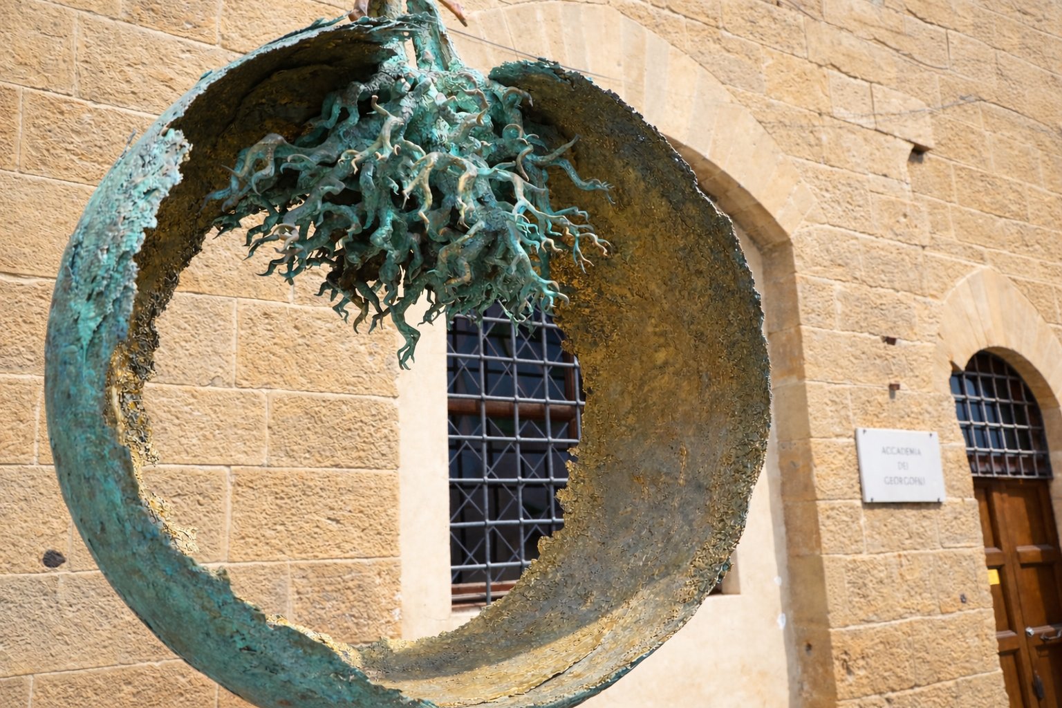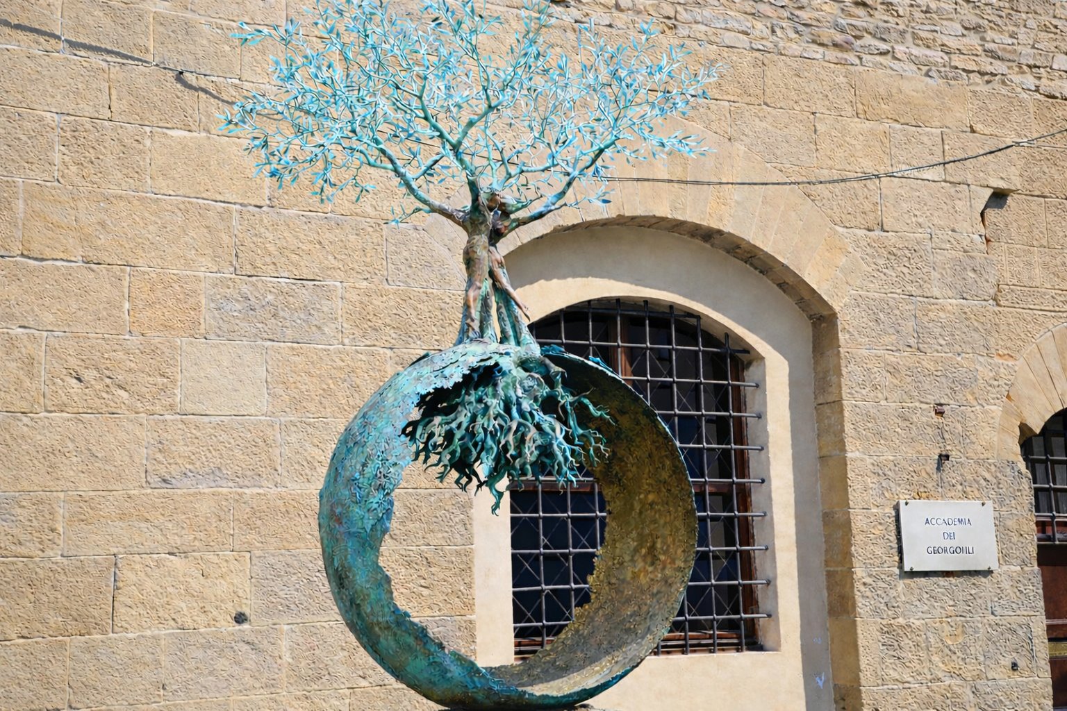 Both their daughters spent a semester abroad studying in Florence, Italy. Their youngest daughter Elena designed their wine label, featuring a stylized ring connecting to an image of an oak tree. Each label depending on the bottling, is a slightly different color. This visual is modeled and inspired by a public sculpture on via dei Georgofili in Florence, Italy, by acclaimed artist Andrea Roggi. The piece is titled Albero della Pace which translates in English to: Tree of Peace. Roggi specializes in a diversity of art including poetry and painting but perhaps he is most known for his eye catching sculptures. The bronze Albero della Pace sculpture is mounted on a solid stone pedestal and depicts a ring joined with an olive tree. The piece commemorates a tragedy resulting from a bomb explosion next to the Uffizi Gallery on May 27, 1993 killing five people, destroying a tower and part of the museum including valuable works of art.