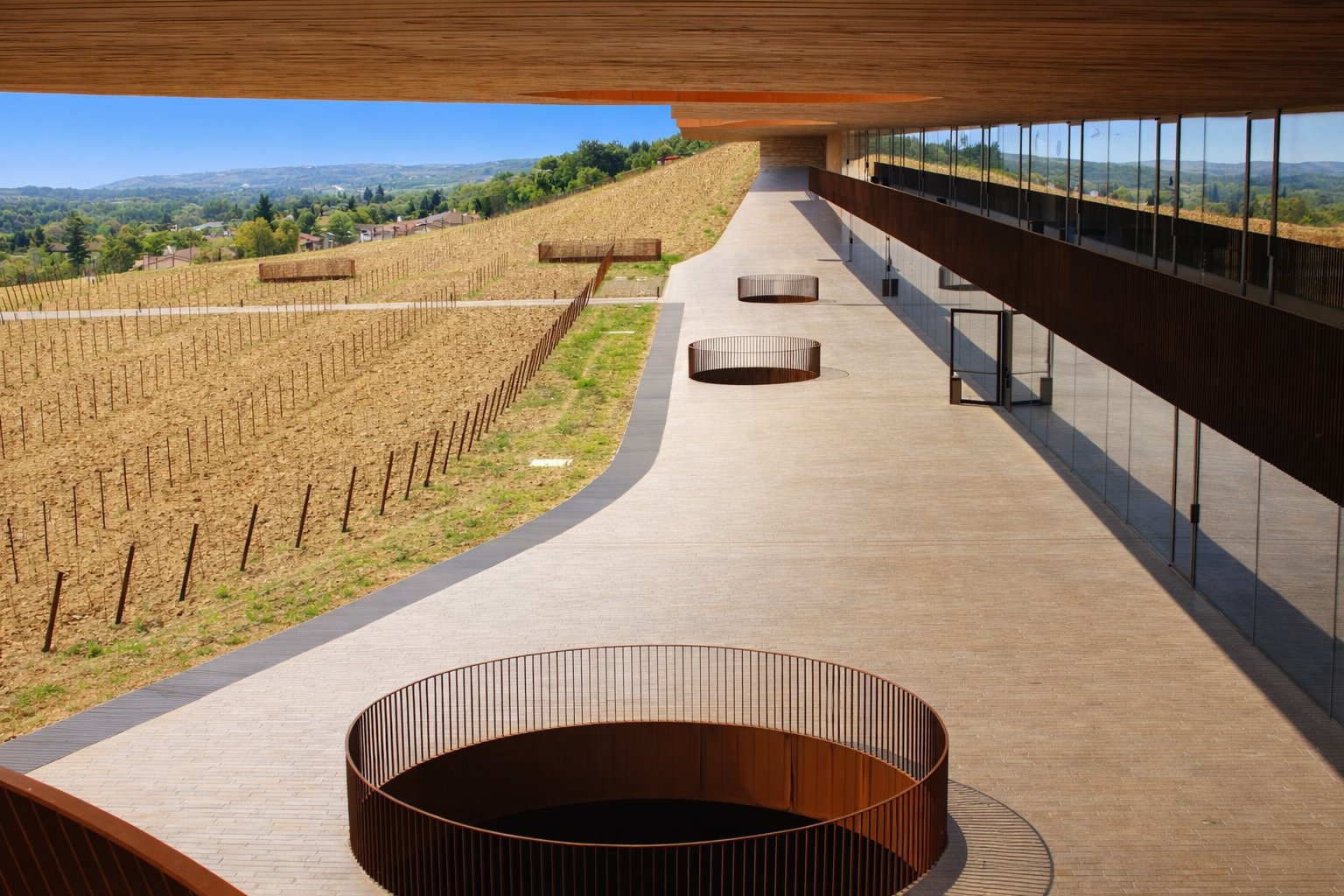 The parking garage is an artistic piece in and of itself. Parking garages worldwide are generally mundane boring “boxes” where one leaves an automobile for a while and are constructed in a way that one has no interest in lingering inside. Not so with the one here; it is an beautiful piece of art that create an anticipation of actually seeing the winery. Cities that rotate around the automobile such as Los Angeles would benefit by taking careful notes on this particular design.