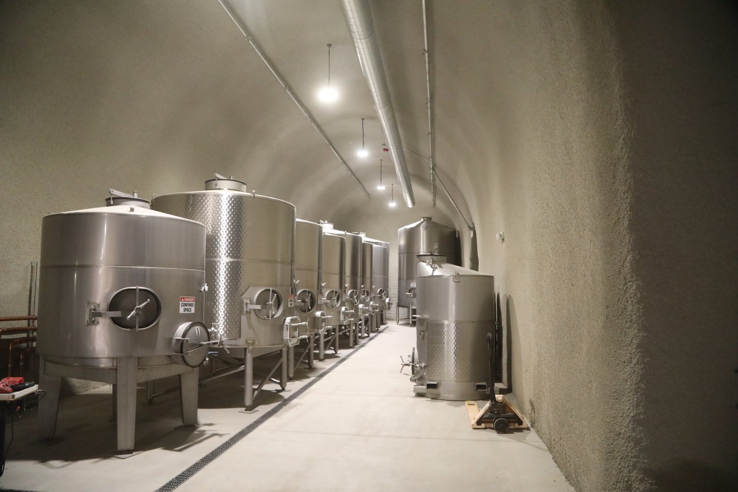 Seven thousand square feet of wine caves were originally built into the hillside (next to the winery). Parts of the caves were drilled through almost solid rock and as a result the cave construction took significantly longer than originally anticipated. As part of their upgrade, another 12,000 square feet of caves were completed in 2020. For many years, an outdoor area next to the cave entrance was used for storing tanks and select fermentation – certainly a challenging environment with difficulty at times maintaining a desired temperature control. With the additional space, all their tanks are now stored inside the cave. The new part of the cave was drilled so the vertical reach is 22 feet from the floor to the ceiling, a much more spacious interior than most wine caves in Napa Valley.