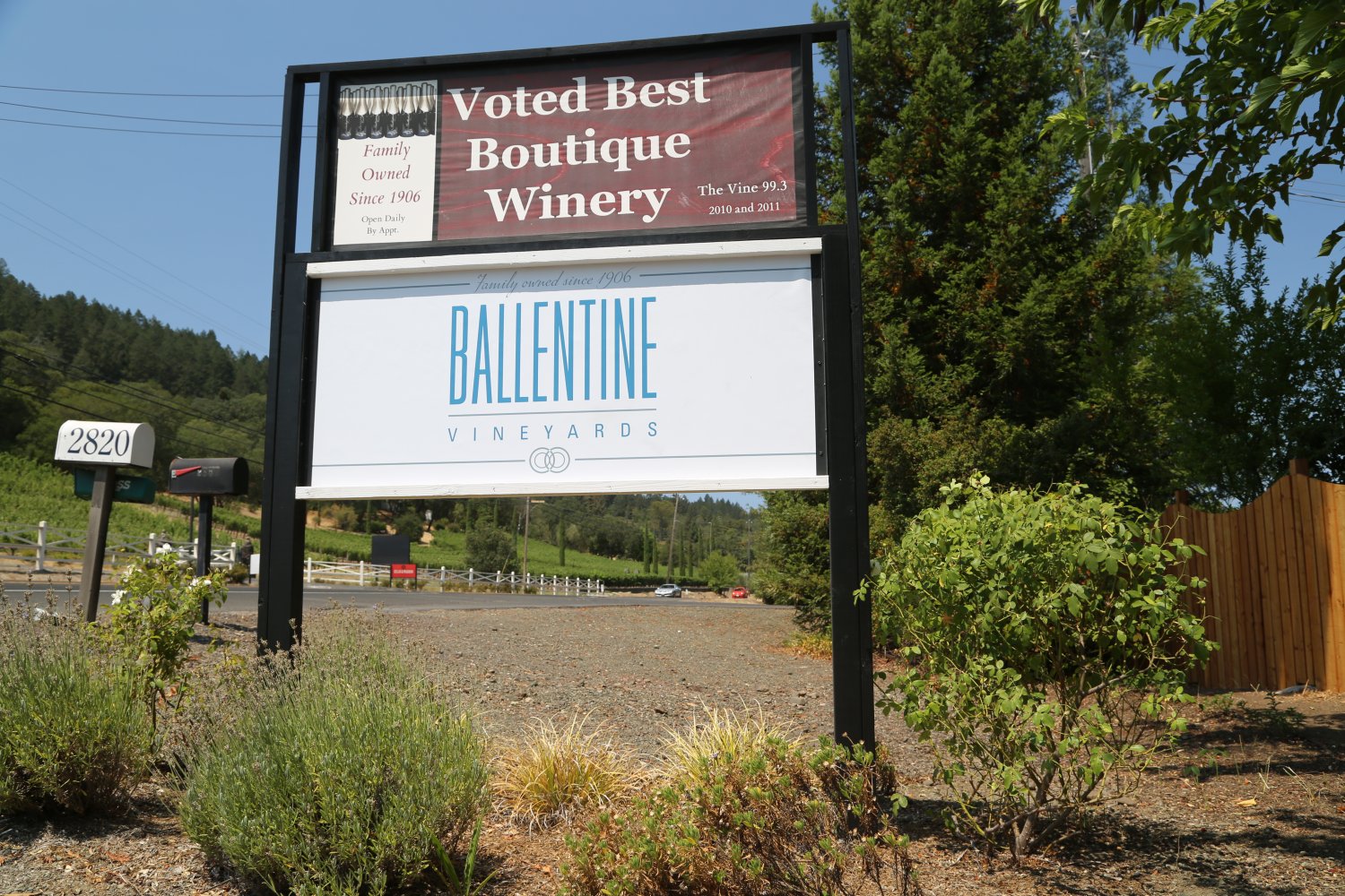 Ballentine Vineyards is located directly across from Faust Winery (previously St. Clement Winery). One driving by on Highway 128 used to only see their sign from the northbound direction (that is no longer the case); during early visits, we used to see bumper stickers in their tasting room that read, “Where the Hell is Ballentine Vineyards”! The answer to that question is simply, just north of the town of St. Helena.