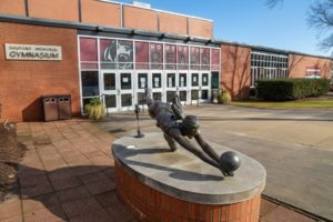 The athletic center with the adjoining Shuford Gymnasium also houses the university’s Sports Hall of Fame presented in display cases covering the sides of several walls; walking in from the main entrance, Hank’s plaque is found all the way to the back of the exhibit – as one of plaques on the bottom of the display case. He graduated from Lenoir-Rhyne University in 1960 and was inducted into their sports hall of fame in 1994.