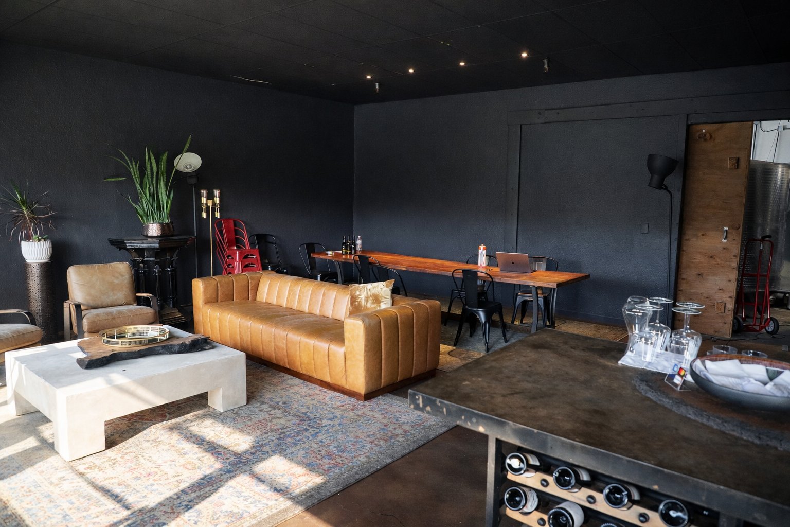 In 2021 Chiron Wine moved into their first ever dedicated winery and hospitality space located in an industrial zone a few minutes’ drive south of downtown Napa. This area is known as the ‘Crusher District”, named for numerous wineries who typically do not own vineyards but make their wine in this part of town and often have associated tasting rooms. This space was previously used by Y. Rousseau Wines. Since Chiron moved in, the tasting space was completely renovated and features an intimate room for guests to enjoy the wines, directly next to the entrance to the barrel room and winery. Several large pieces of art were displayed on the walls; these are original paintings by Bobby’s wife.