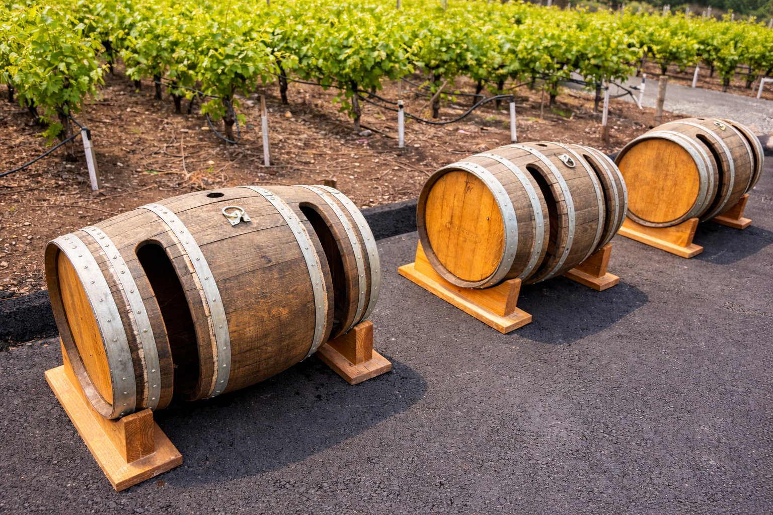 Part of the Napa Valley Vine Trail runs past the west side of Clos Pegase’s property leading to Calistoga. This bike and pedestrian path offers a relaxing respite from driving and passes near several wineries, the Calistoga reclamation plant and through vineyards. Following some of our visits to Clos Pegase, we’ve taken 15-30 minutes to hike this trail. Alejandro, a jack of all trades who works for the Adair family, presented a prototype of a wine barrel bicycle rack to Jay Adair. He liked it and Alejandro ofrered to make more. These are among the most creative uses we have ever seen for used wine barrels; four such barrel bicycle racks are located near the main entrance to Clos Pegase.