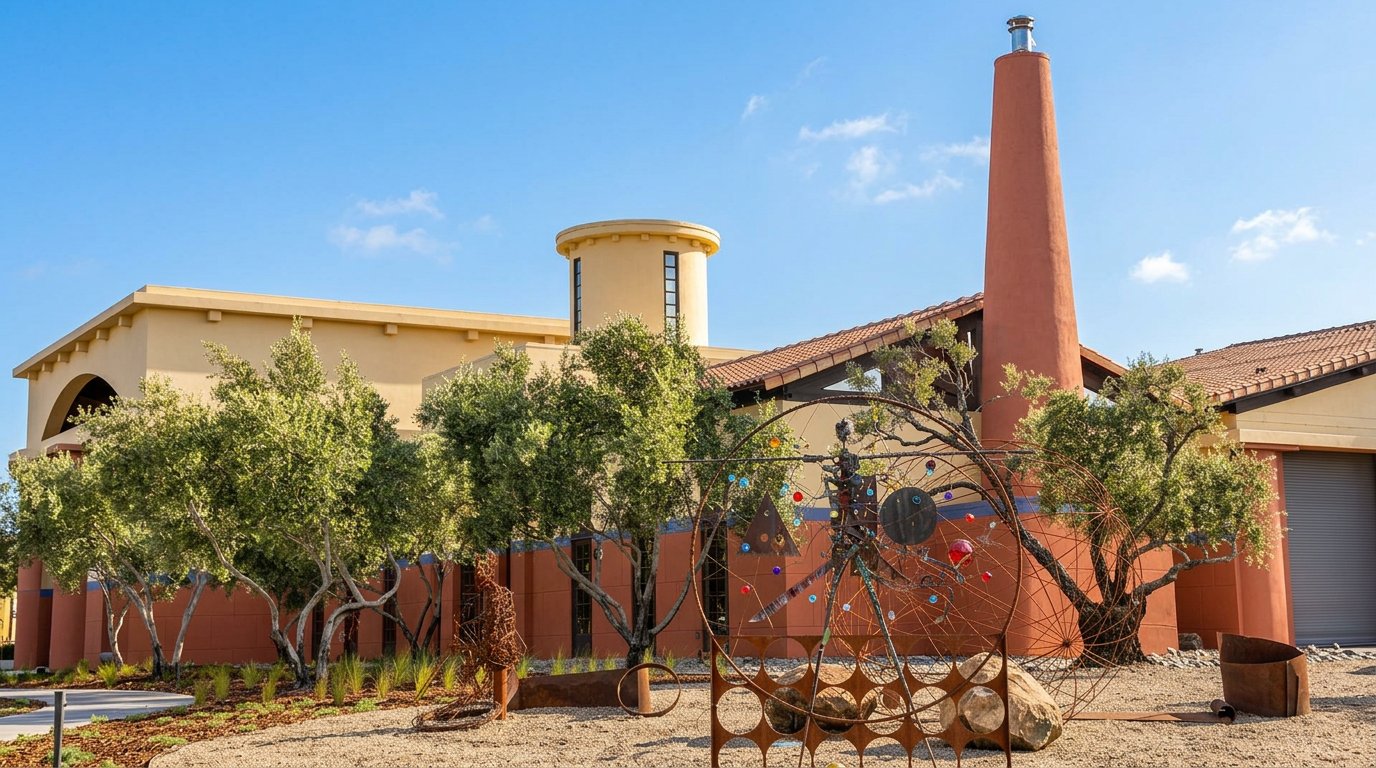 After being closed for about a year, Clos Pegase hosted their ‘soft’ re-opening on March 21, 2026 and had their official opening on Saturday April 11, 2026. As part of the refresh, Clos Pegase updated the exterior of the winery to its original colors. And the winery once again features an art gallery; the inaugural artist in 2026 was Calistoga residence and muralist, Carlo Marchiori. Several sculptures are displayed on the property, created by local sculptor Guy Pederson. These include a piece titled, Vitruvian Man made of glass, copper and steel and another untitled piece that greets visitors at the main entrance.