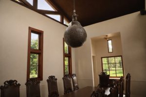 The grounds are beautiful and well landscaped especially the large cypress lined inner courtyard. Much of the landscaping, designed by landscape architect Daniel Nolan, is drought tolerant. For many years various statues graced the property, some were quite bizarre like the one of a thumb sitting next the grape rows which was probably their most photographed piece. One of the few pieces of art on the grounds left from prior ownership is a marble statue of the god Bacchus and the impressive Torino Royal Bacchus fountain made from Carrara marble – this used to be owned by Italian royalty and dates from the 17th century – perhaps it is the oldest fountain at a Napa winery. It was a gift to Jan from Mitsuko. And what became an iconic piece in their collection, the Hanging by a Thread – is a massive looking ball that still hangs from what appears to be frayed threads in a side room next to their original tasting room (now used for hosting club members).