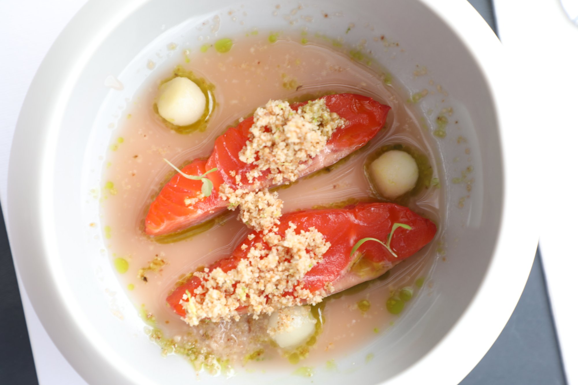 The 2024 Cuvaison Grenache Rosé, Mount Veeder Napa Valley is pale salmon in color; the bouquet smells elegant with lighter red fruited tones including of raspberry, wild strawberry, rainier cherry, ruby grapefruit, a marine salinity, pomegranate, thyme, mint, and some floral notes including of hibiscus and rose petals. Balanced wonderfully between flavor, acidity and texture, this wine tastes like wild strawberry, raspberry, strawberry guava, ruby grapefruit without any pithy character, Rainier cherry, and a light note of dried herbs including thyme. The finish persists with a note of sweet fennel and dried anise seeds. Its texture is a complementary character, sporting a rounded and supple mouth feel, lifted nicely by its vibrant acidity. We would like to pair this with a miner’s lettuce salad drizzled lightly in olive oil with a pinch of salt, pepper and a few drops of freshly squeezed lemon juice. This wine has a listed ABV of 13.5% and was produced direct to press.