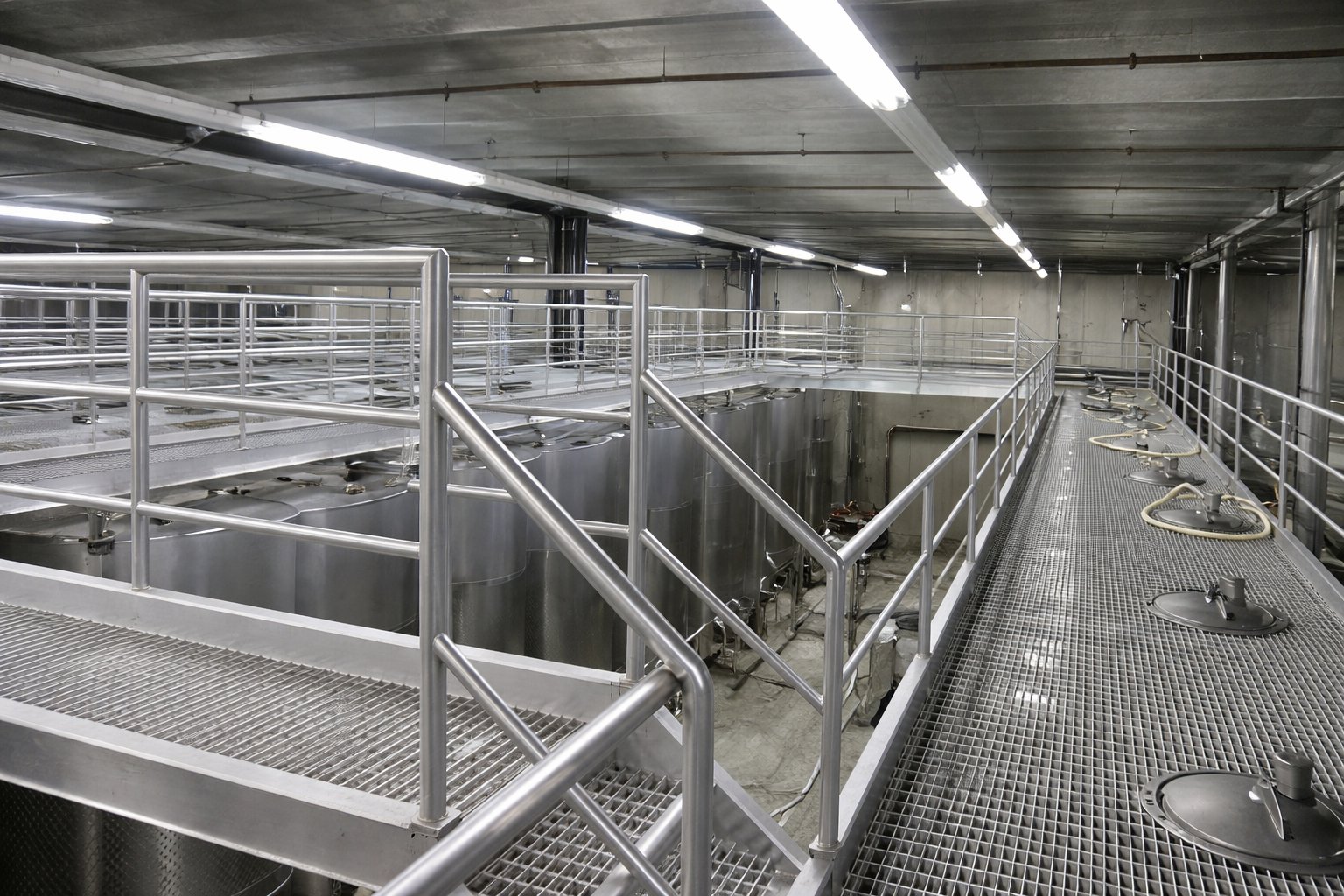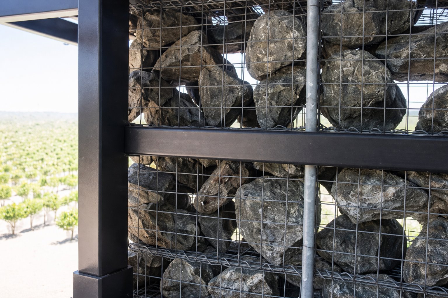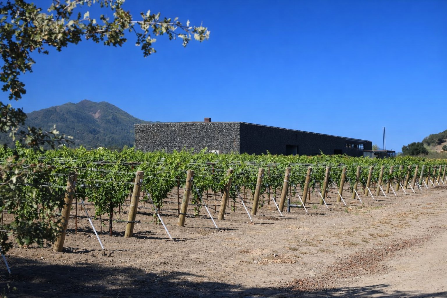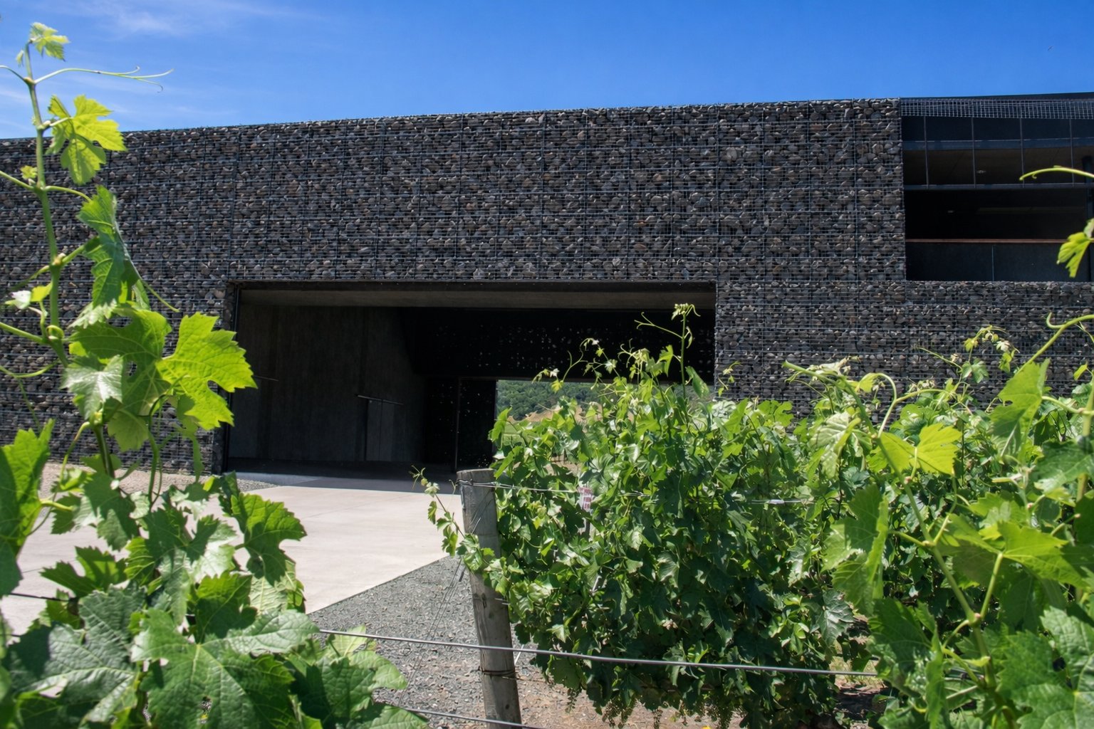 The building is stunning yet at the same time a humble testament to Christian’s desire to build a winery that that does not visually conflict with the natural beauty of the land. The exterior walls, called Gabions are essentially galvanized steel cages containing natural rock. This basalt rock was mined from nearby American Canyon and sits loosely in the cages providing protection from the heat of the summer as well as allowing natural light to shine through during the day. The smaller stones re located on the lower reaches of the walls (as the lower interior space requires more insulation). Both barrel rooms, main tank facility and offices are contained within its walls. The building was completed in 1997.