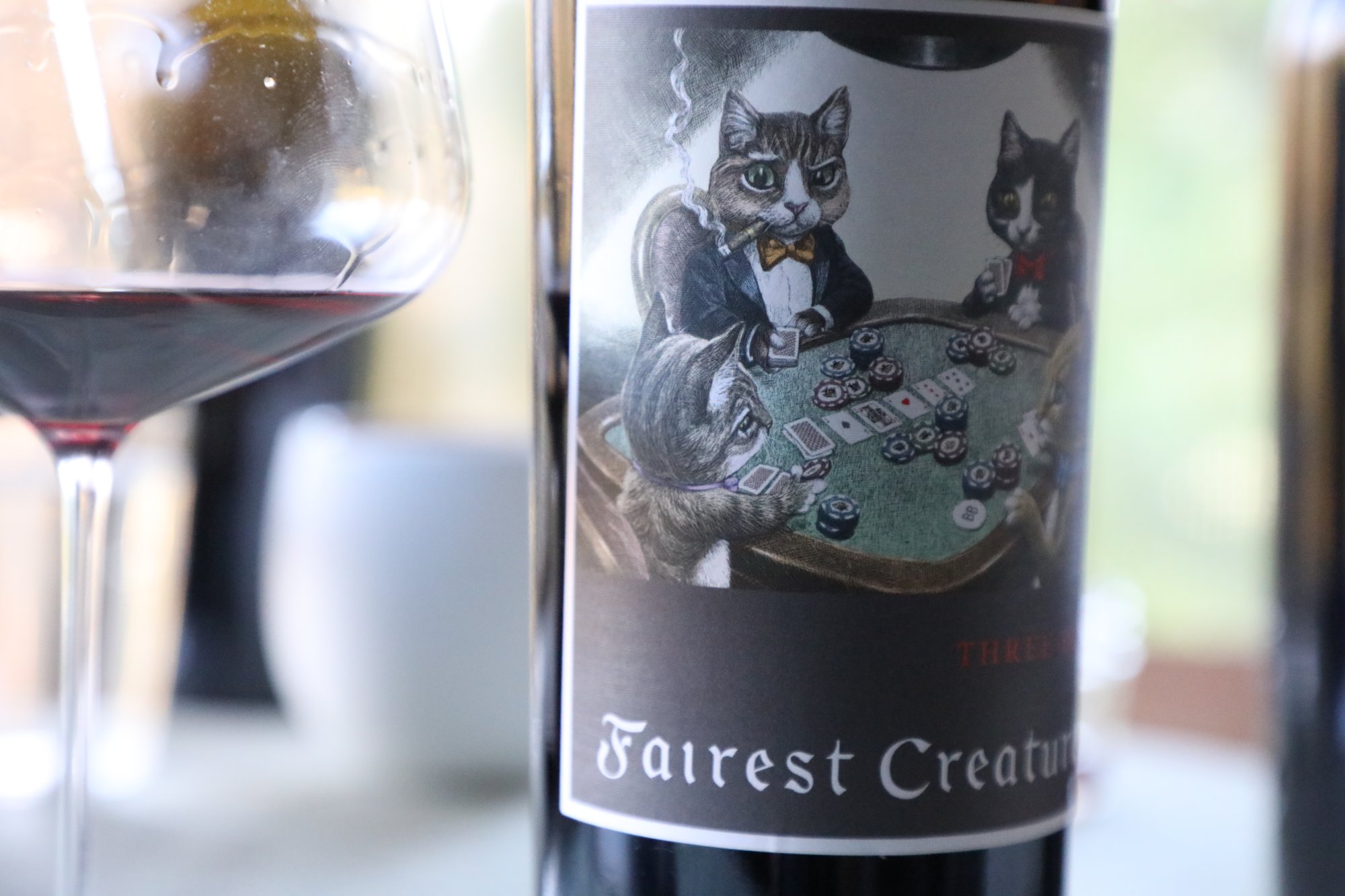 The name, Three Bet in poker refers to a strong hand, cards that allow you to keep betting comfortably. And like all of the Fairest Creature labels, this wine label immediatley draws you in; each of the cats wears a bowtie with a color representing each winemaker. And the big cat smoking at the poker table represents Rolland.