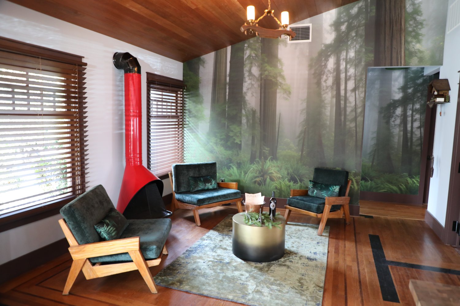 This space was previously used as an attorney’s office. Joe and Jeff oversaw a full renovation of the interior including demolishing several of the walls, in the process leaving an outline in the floor of the original rooms. Three separate but joined spaces are thoughtfully furnished, highlighting three parts of California including southern, central and the northern part of the state. The mural of the redwoods pays homage to the 15 years they owned and operated the Redwood Walk in Fortuna, CA.
