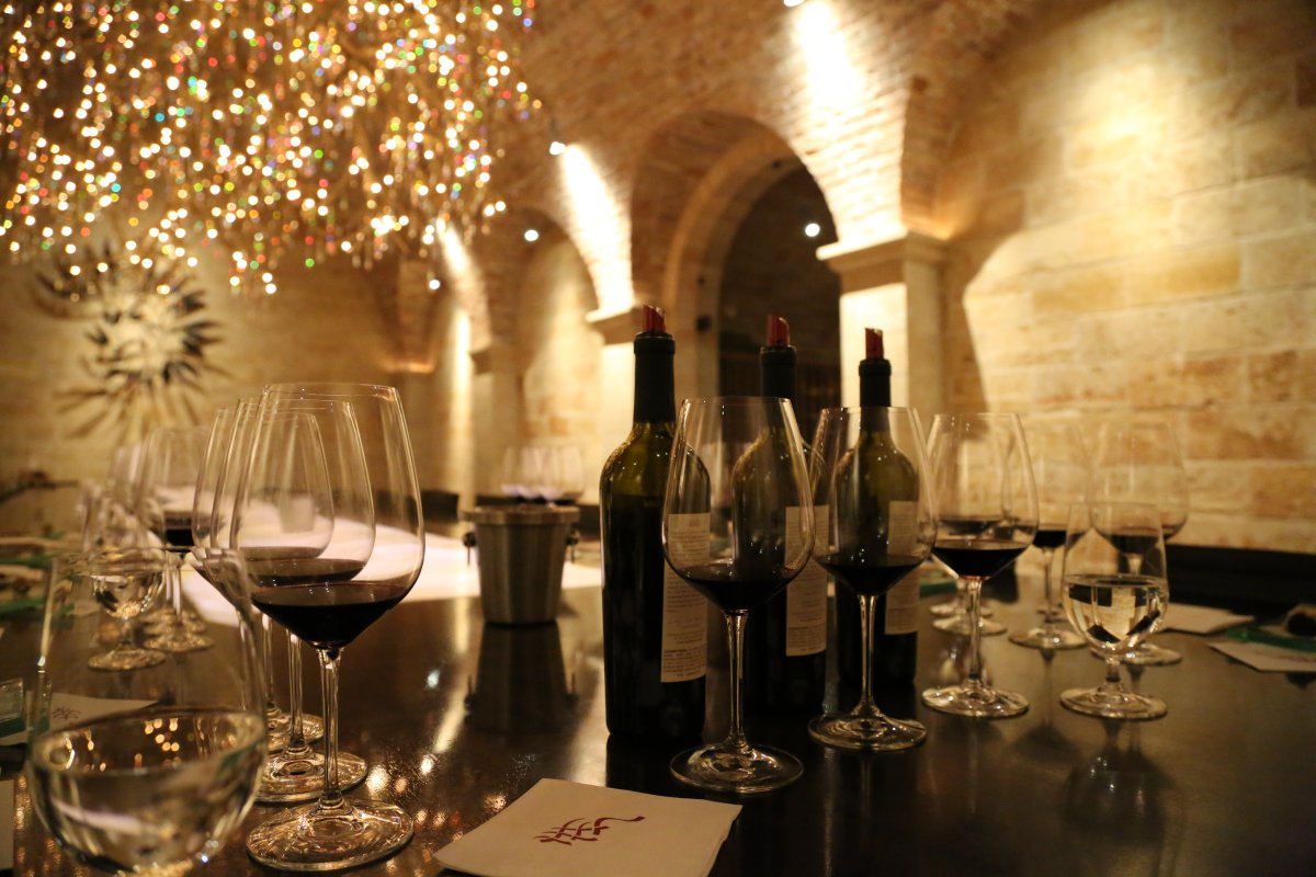 Tours end in the tasting room. This is no ordinary room; a brilliant chandelier containing hundreds of Swarovski crystals hangs from the ceiling. Its shape represents grape roots as one would see them growing in soil and was designed by the American sculptor Donald Lipski. He is in part known for his grand public works of art including pieces in New York at Central Park, Grand Central Terminal and Grand Central Market. And some of his works are on permanent display in major museums within the U.S. A massive mahogany table with inlaid white onyx is in the center of this room; this onyx changes color with a turn of a knob controlling the sunken lights. A tasting typically includes four appellation specific red wines.