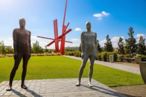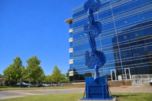 This is not your typical business park; driving through the park one is greeted by numerous pieces of outdoor works of art. Over 200 sculptures are located within the park collected by the HALL Group from a diverse group of international artists. Most of the works are outdoors however, additional pieces are located within all of the office buildings. Several works among the 200+ pieces stand out including Rose Petals by Dennis Oppenheim, Jaguar, a massive linear piece all in red by John Henry and the visually intriguing and odd Giant fish eating a House by Joe Barrington.