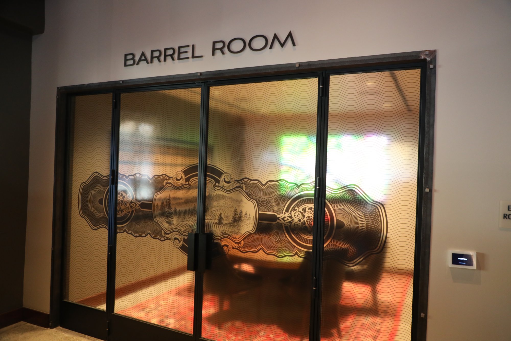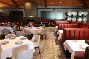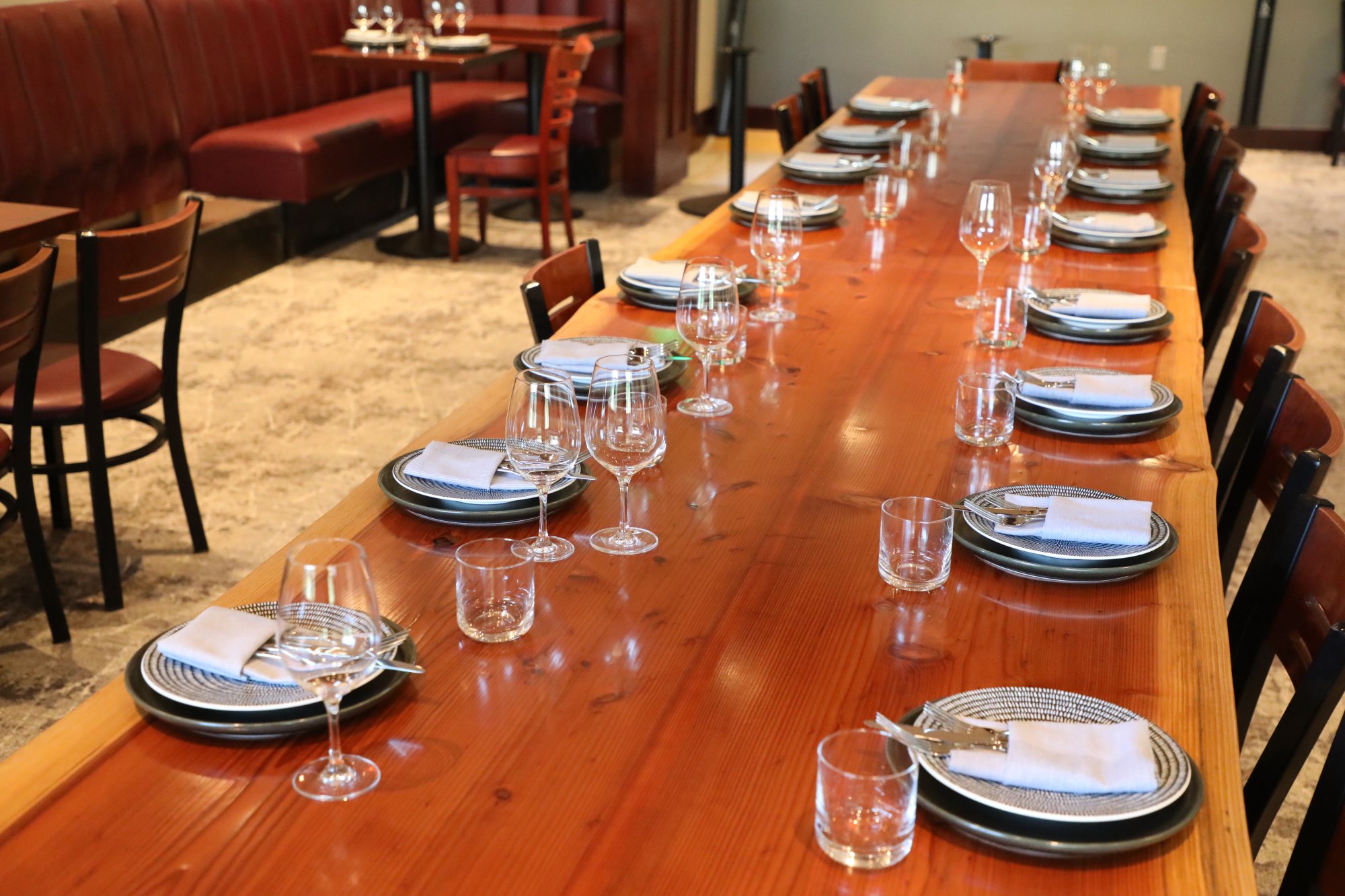 Betsy oversaw the renovation inside; advice from others was to remove much of the interior and paint the ceiling white and the beautiful mahogany, black. For reference it was calculated this space has more than 5,000 linear feet of mahogany. During the renovation, even more mahogany was added. One of her neighbors is a talented wood worker; he milled a large table for their private events room from a redwood that was killed during the Tubbs Fire. Several tables were created from old riddling racks previously used at Schramsberg Vineyard.