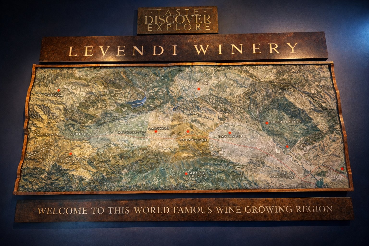 In early April 2022, Levendi Winery opened a tasting room in downtown Napa at 1465 1st Street in the space that formerly was used as a bank, then for Gordon Heuther’s downtown Napa art gallery (one of Gordon’s sculptures still stands at the entrance to the corridor leading off from 1st Street), followed by Studio M (a high-end wine salon) and more recently, Cornerstone Cellars. Gordon’s version of the Napa River, inlayed into the floor has fortunately survived the transition throughout all the occupants, since he vacated the building years ago.