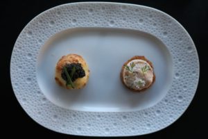 The restaurant is located in the same space as the hospitality center with a feel that is both simultaneously farmhouse married with modern elegance. The indoor dining space is intimate and seats only a handful of tables. An adjoining outdoor space is also available with heat lamps as needed. The focus is on small but very rich plates featuring both local ingredients from local suppliers (including from the 26-acre JUSTIN Farmstead with orchards, vegetable gardens and edible flower fields) as well as ingredients sourced from further afield. The menu is highly seasonal.