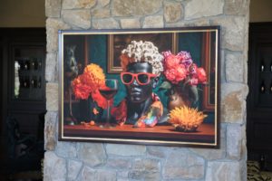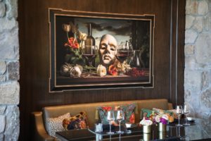 Lewis Cellars officially opened for tastings in this space on October 22, 2025 with the ribbon cutting ceremony starting at 11am on October 28th. Renovations were extensive, both in terms of its exterior and interior; the interior decor was overseen by Lynda Resnick. During her talk at the ribbon cutting, she referred to the inner vibe as being, “unapologetically indulgent”. The hospitality space features offers a sensory complement to their wines, featuring the wine influenced works of central California Coast based mixed-media artist Zachary Scott. The interior is elegant, with an old-world European feel and almost whimsical at times. And the eclectic playlist matches the vibe of the interior. In addition to the primary hospitality space, additional spaces include an indoor and outdoor salon privé. Guests are encouraged to have reservations but walk-ins are also welcome, space permitting.