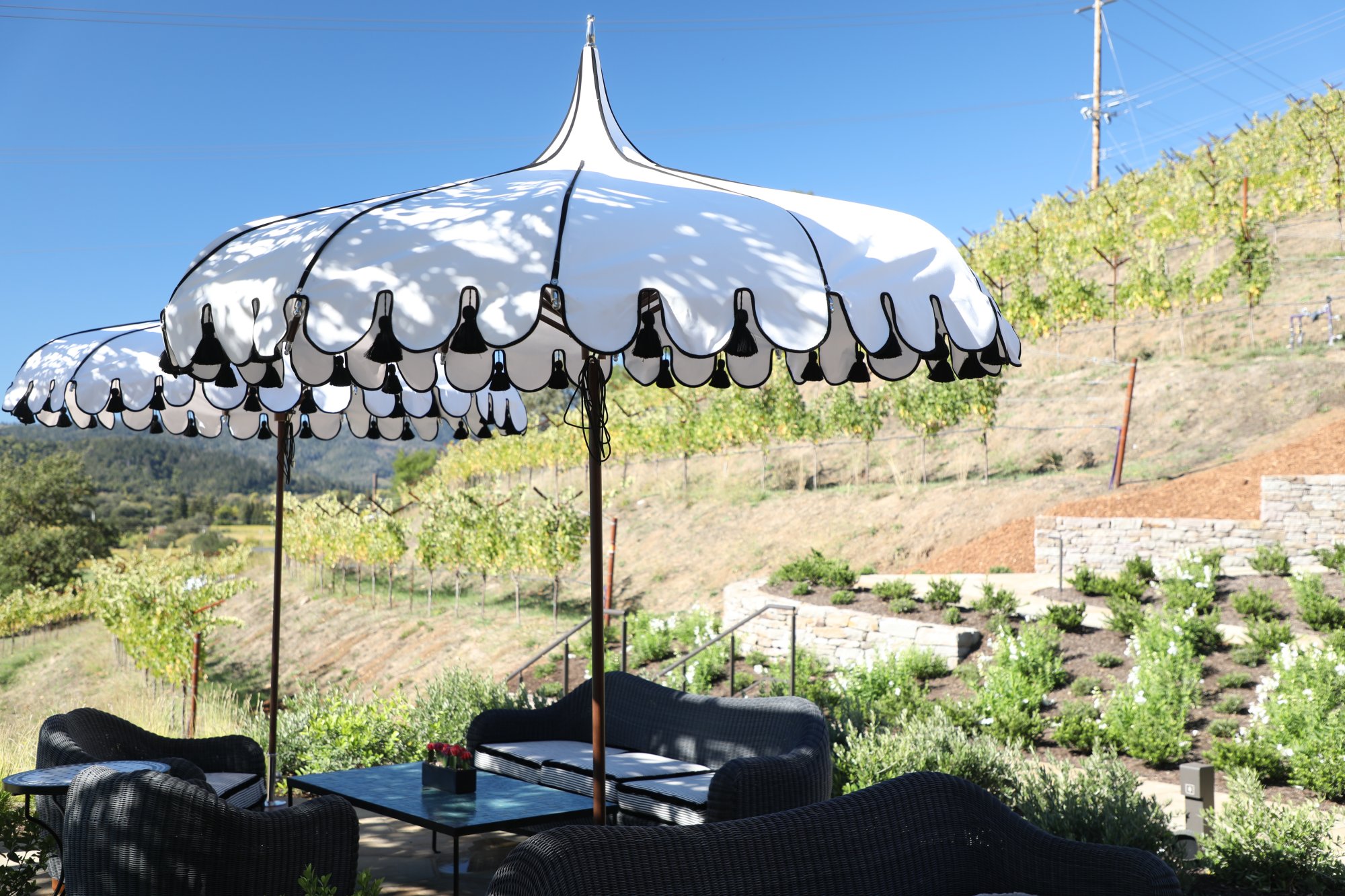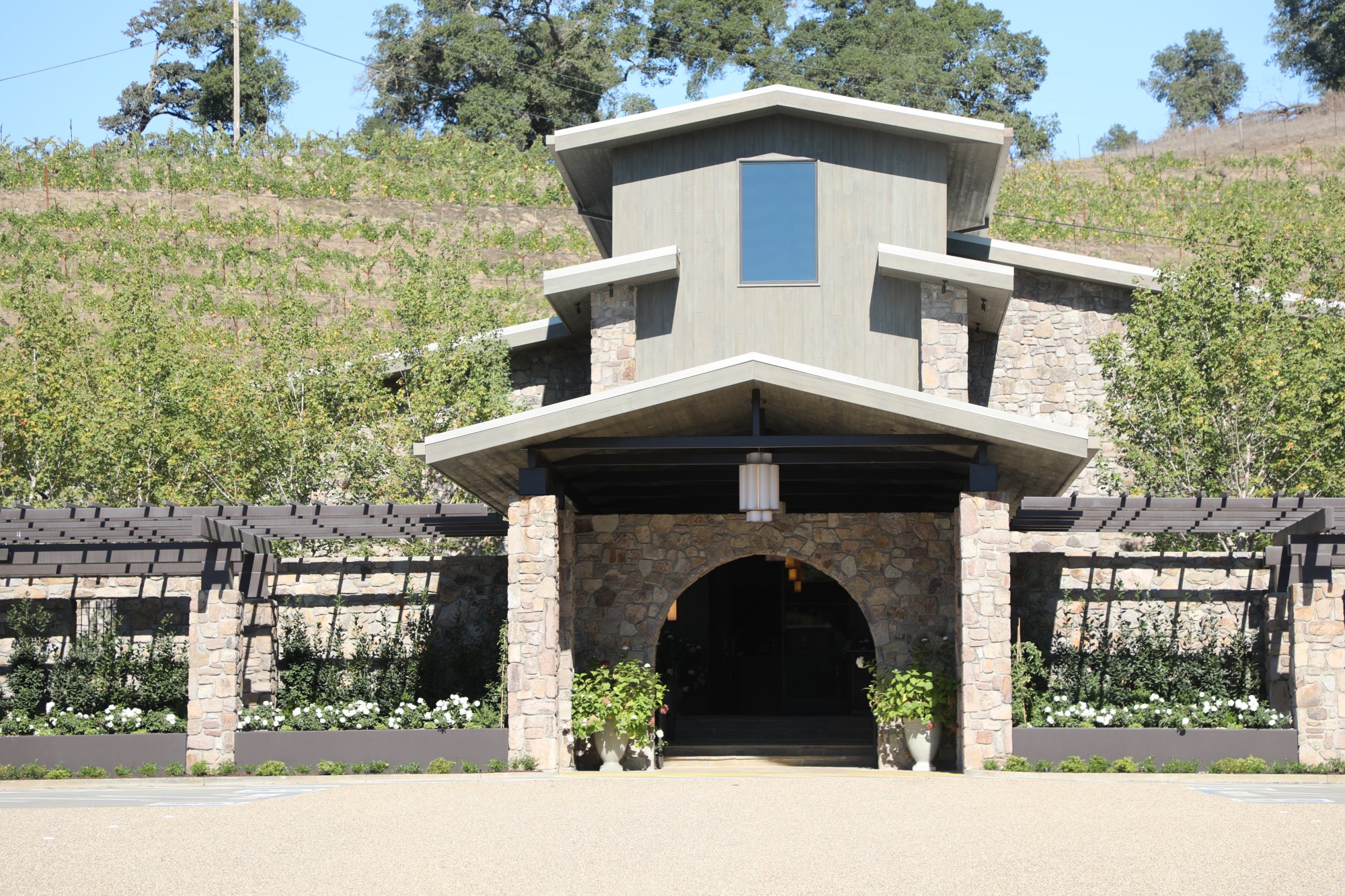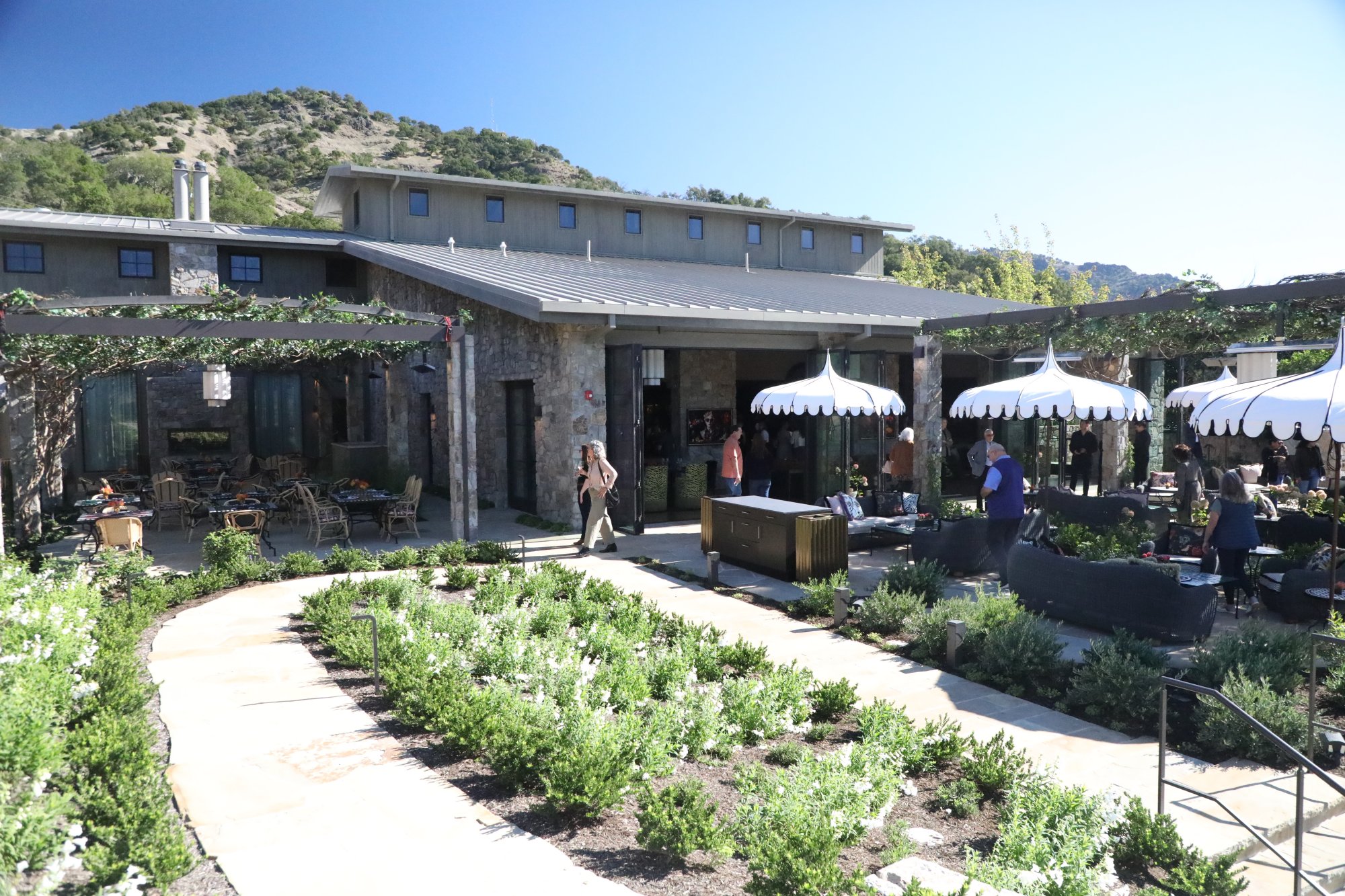 Visits are by appointment (although if not too busy, they may be able to accommodate walk-ins) with seated tastings at tables held outdoors on a terrace overlooking nearby vineyards with some of the tables under an overhang. A long bar inside can host stand up tastings. As expected, guests are given a bottle of Fiji water to start their tasting. Tastings are relaxed and are paced according to each party and include a number of wines which are not distributed. A tasting can also be combined with lunch.