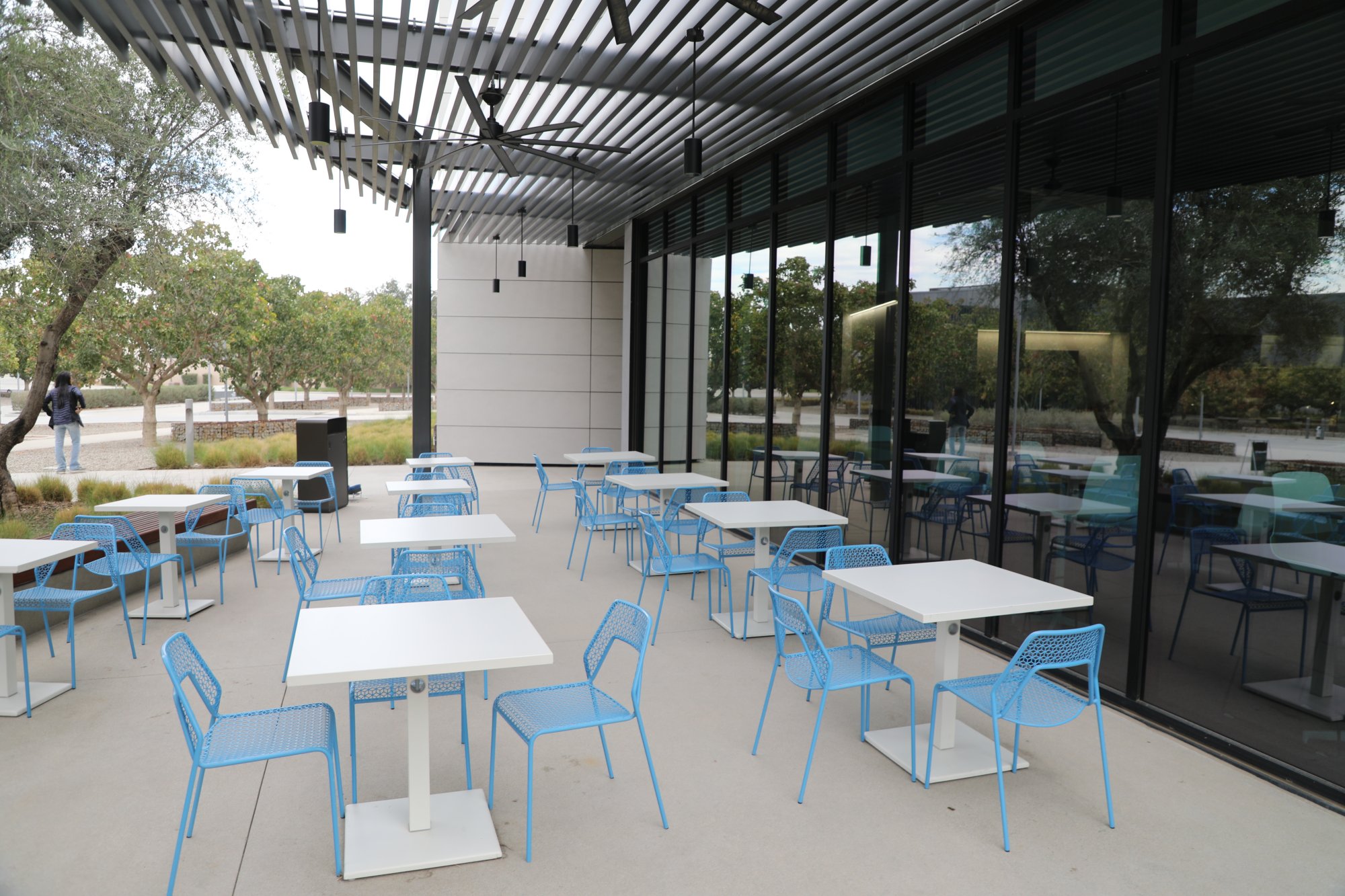This student union building is 84,000 square feet and opened in the Fall of 2022. We have visited several times including during its construction and once the building was completed. Its construction was helped made possible with a generous 10-million-dollar donation from Lynda and Stewart Resnick. It contains a conference room, meeting rooms, a café and three other food options, a spacious indoor seating area accessible from the first floor, a third floor with a sizable workspace for students, the Wonderful Scholar Center and 24/7 access student study rooms and a rooftop lounge.