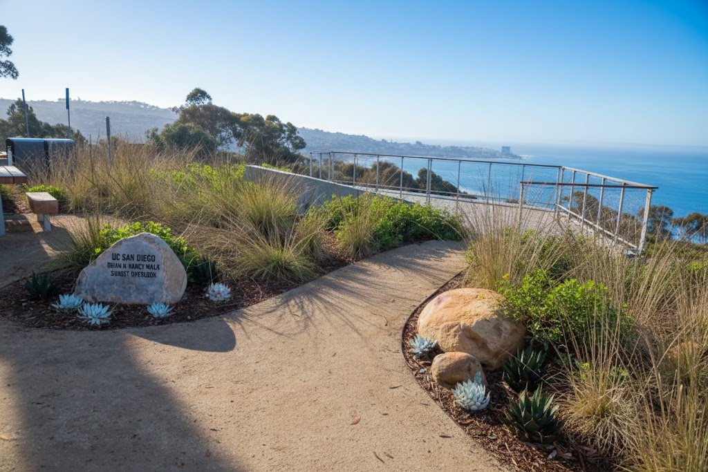 This scenic overlook opened to the public in July 2025; it is located on the corner of Midpac Lane and La Jolla Shores Drive on campus of The University of California San Diego. Parking is curbside on La Jolla Shores Drive. Or two handicapped spaces are located next to the lookout. The space features sweeping views of the Pacific Ocean with several places to sit and view the scenery.
