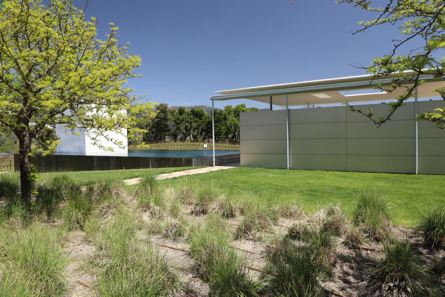 One of the highlights of the property is a James Turrell designed infinity pool, square art installation and adjoining bath houses, collectively called Stone Sky. The only access to the square cube in the pool is by swimming under water (4 feet deep) and then entering its square confines. For reference, another Napa Valley winemaking family, the Hess’s (Hess Collection Winery) own a James Turrell dedicated museum and art space at their Bodega Colomé Winery in northern Argentina (the Salta region).