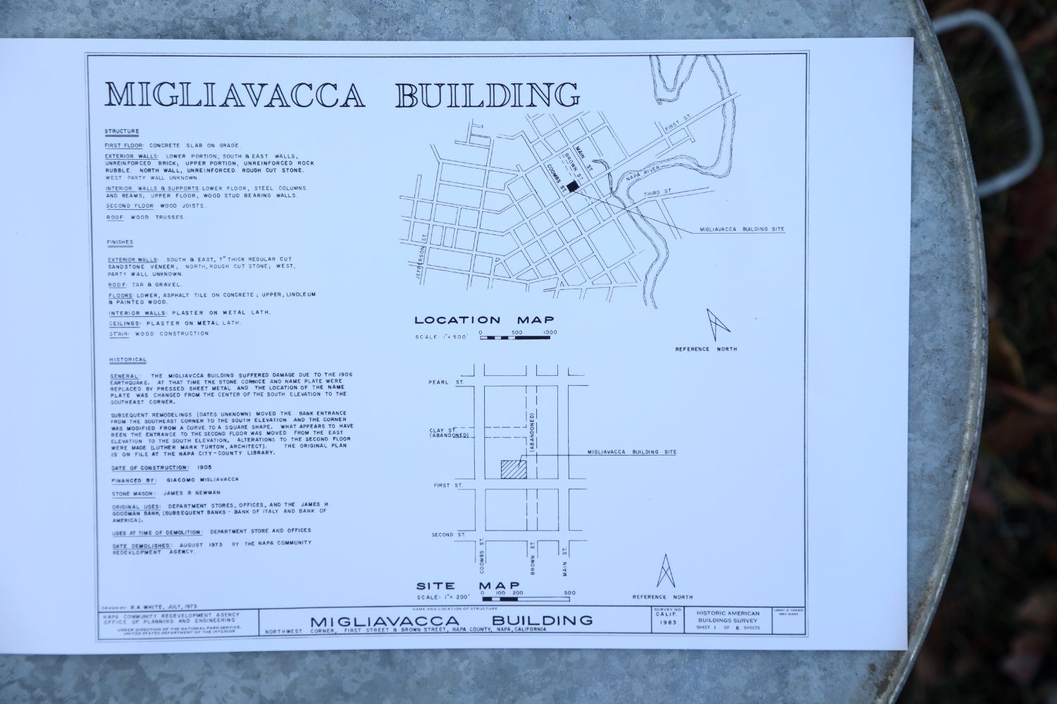 In late summer 2025 a 300 million dollar project was started in downtown Napa invested in by Danville, CA based 300 Venture Group. This project called Napa First Street, includes the former site of the Migliavacca building; the new building will incorporate design elements from the original Migliavacca building. Once this project is complete in 2027, we will visit this building and add photography here.