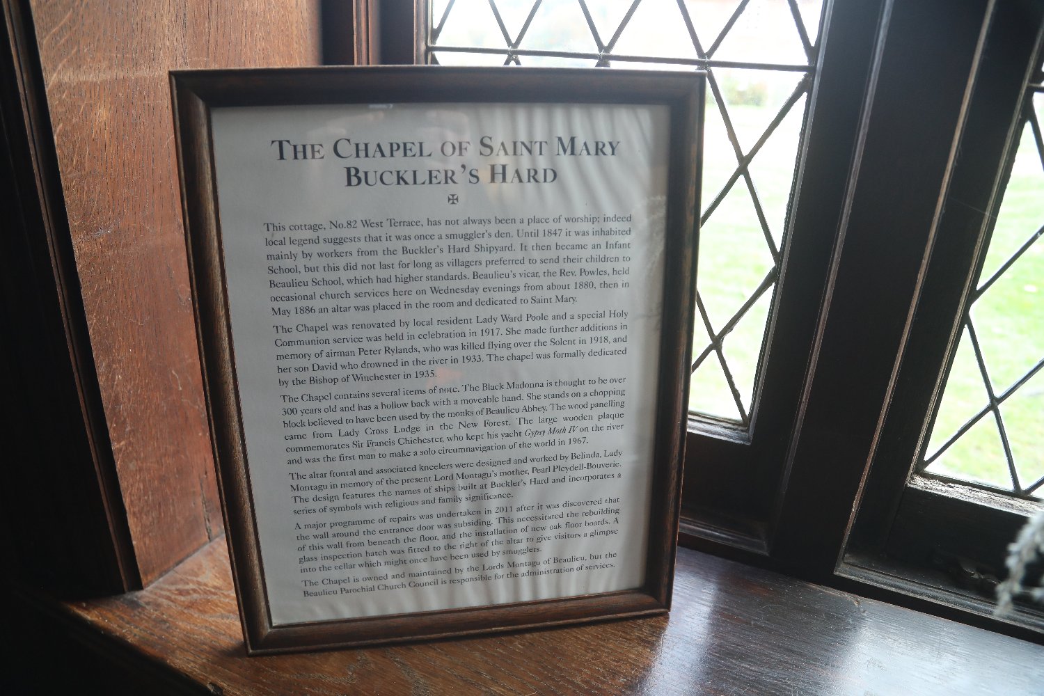 Buckler’s Hard is located a few minutes’ drive from Beaulieu; this privately owned estuary is part of the Montagu family ownership. Admission to Buckler’s Hard includes the maritime museum, the village, St. Mary’s Chapel (previously used as a smuggler’s den and contains a unique Black Madonna) and the Shipwright’s Cottage among other attractions. An approximately two-mile one-way path leads from Buckler’s Hard to the Beaulieu Estate, roughly paralleling the Beaulieu River.