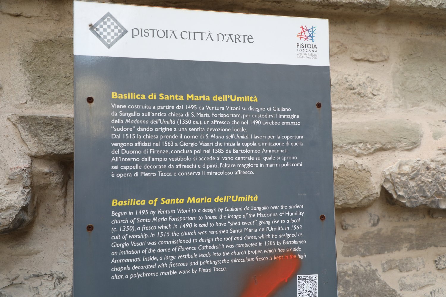 Pistoia (population 90,000) is home of the Basilica of Santa Maria dell’Umilta, with construction started in 1495 and ultimately finished nearly 100 years later in 1585. The dome was designed by architect Bartolomeo Ammannati and was built to resemble the dome of the Florence Cathedral. Perhaps more locally famous than the church itself, is the fresco inside, dating from 1350 of the Madonna of Humility which in 1490 according to local lore, shed sweat resulting in a cult like followership.