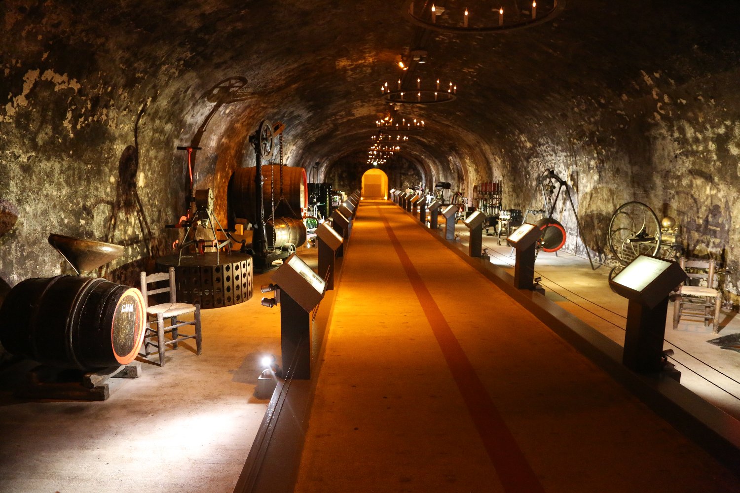 Following the film, visitors enter the cellar. The tour offers a fascinating look through some of their historical and contemporary production with a visit to only part of their 25 kilometers of underground tunnels. Like other caves in parts of Champagne the tunnels are carved out of a white chalk (one can feel the walls are slightly damp to the touch). Several highlights of the cave tour include one room that houses some of their oldest wines and a large room that contains numerous pieces of historical winemaking equipment.