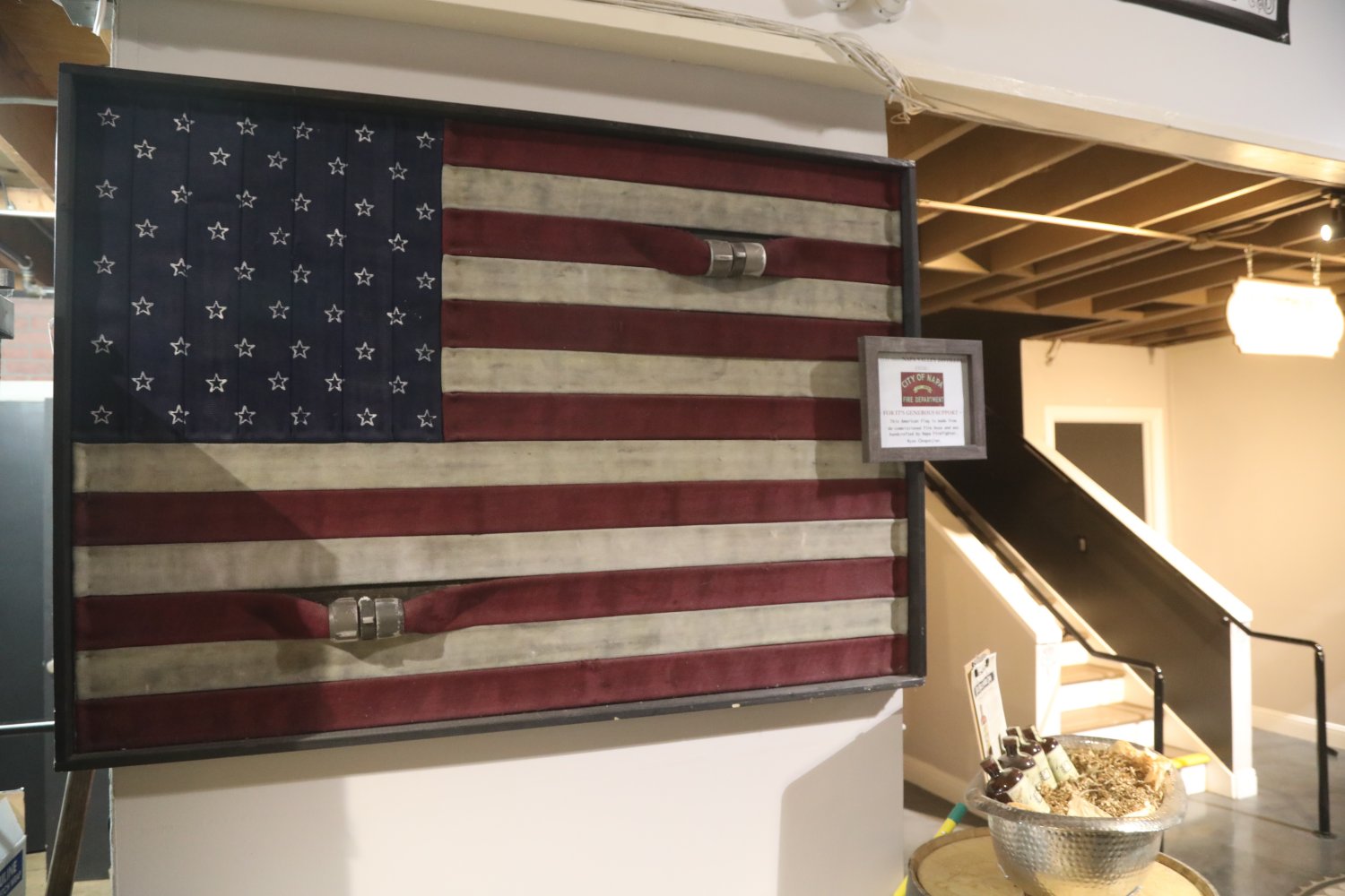 Napa Valley Distillery is open 7 days a week for tours and tastings at the start of each hour. Tours provide a general overview of the distilling process with more details based on customer interest. Visitors should take a moment to pause in front of the large American flag hanging on the wall – it is made from recycled fire hoses – with the colors matching that of the USA flag. Napa Valley Distillery crafted a special whiskey which helped raise nearly $20,000 towards helping out firefighters who are injured or need help in retirement.
