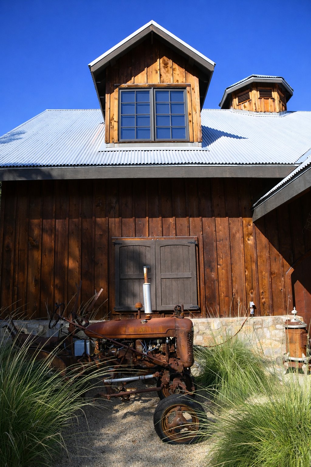 Many of the materials used in the construction and decoration of the winery had previous uses and have been creatively re-purposed. This includes the metal cages surrounding the outside lights; these were made from wire that held their olive trees in place when they were transported to the property. Baling wire found on the property is now used to cage some of the inside lighting, the wooden planks on the sides of the bench sofas were reclaimed from planter benches used at the nearby Solage Resort, wooden beams are from an old post office in Manhattan Beach, California and the barn’s interior wood was recycled from wooden snow fencing from Wyoming. But perhaps the most intriguing material is the use of recycled blue jeans for the buildings’ insulation.