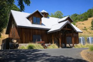 The winery is located directly next to the Silverado Trail just south of Calistoga. This building dates from 1907; it used to be located in Franz Valley (Sonoma County) but was dismantled and rebuilt on the Phifer Pavitt property. It also used to be painted an ugly yellow but when it was rebuilt the yellow was stripped off except for a small rectangular square located underneath the ‘v’ in the word Phifer Pavitt on the exterior (left so visitors can see what it used to look like). The first floor (originally the tasting room) now serves as their barrel storage; the crush pad is located just outside. The second floor was converted into the tasting room; it is spacious and offers a western feel, including sometimes a soundtrack which primarily features old country and western songs. And often visitors hear the numerous black, white and red flea flickers (woodpeckers) ratcheting their way into the side of the wooden barn. And these birds love storing acorns in between the wooden slats.