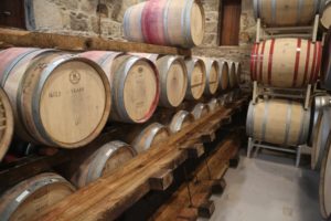 The tour visits their barrel aging rooms, including the one in the old Kraft Winery. Note the old redwood ceiling in this building; it was discovered during their renovations of the building. Two wineries are located on site including one for their red wine production and one for their Sauvignon Blanc.