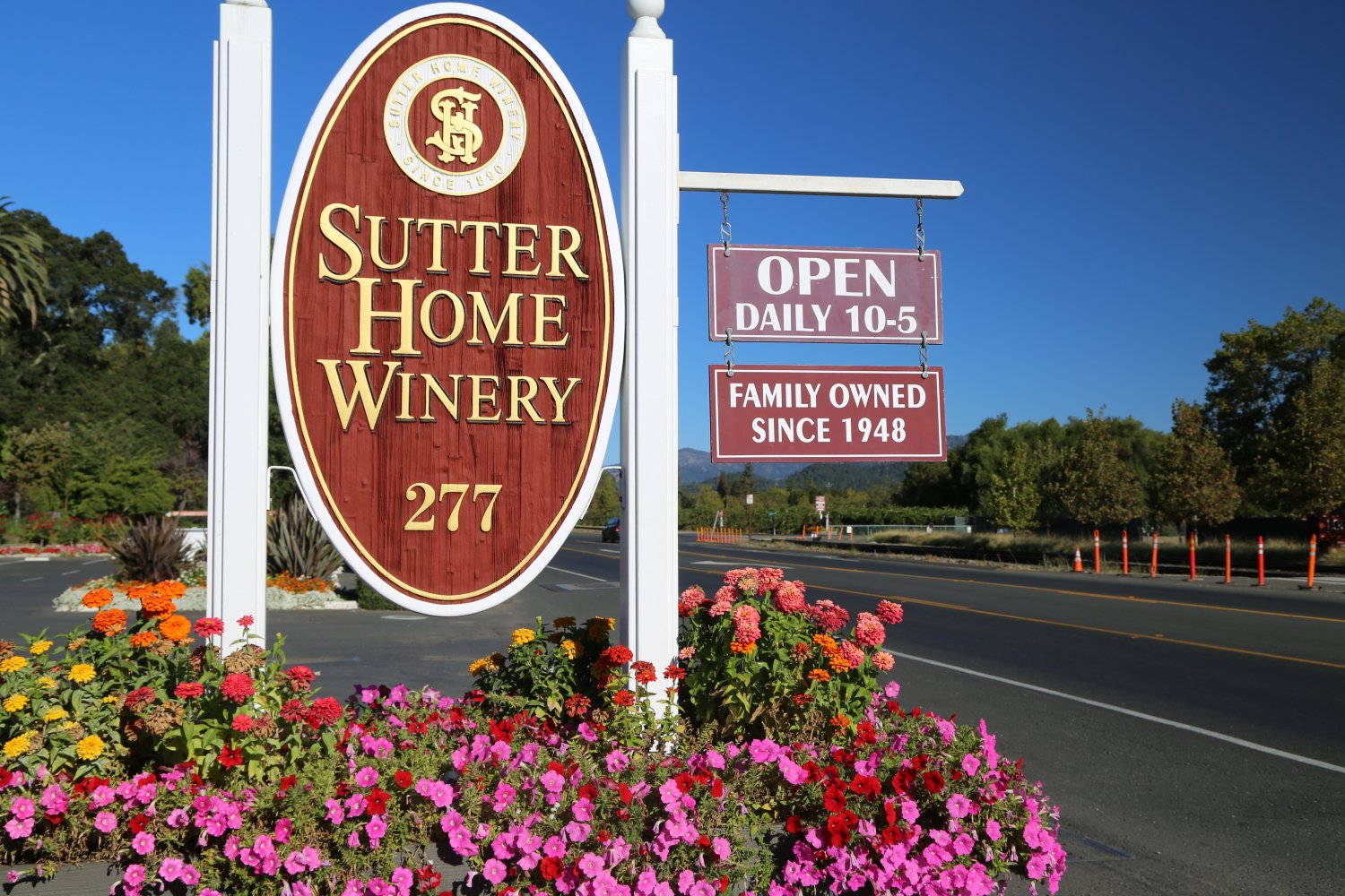 Sutter Home produces some of the most affordable wines in all of the Napa Valley (although one should be aware that the grapes for the Sutter Home wines are not from the Napa Valley). Similar to other large Napa based wineries offering wines at such affordable prices, Sutter Home’s production is sizable, sourcing grapes from outside of the county – all of this helps cut down on overall costs. Where else in Napa Valley can one find a 750ml Muscat dessert wine for $7 or a Cabernet Sauvignon for $8?! Sutter Home maintains a large production facility on the other side of the highway from their tasting room and a massive state-of-the-art production winery near Lodi (some 660,000 square feet).