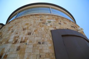 A massive nearly 1,000-pound copper door greets visitors at the entrance; this door is so perfectly balanced on its hinge that often the wind will blow it open. Once inside guests step into a room with a 180-degree windowed view of the surrounding mountains. On a clear day from this room, the views are absolutely awe inspiring. This main room contains a sizable table made from wood dated at over 40,000 years old. It is Kauri wood from New Zealand and is well preserved from being in an oxygen deficient environment in a bog. This type of wood is considered some of the oldest workable wood in the world. While sitting down at this table, look up – a satellite was creatively re-purposed as a chandelier with the exterior layered with a similar look as on the main door of the winery.