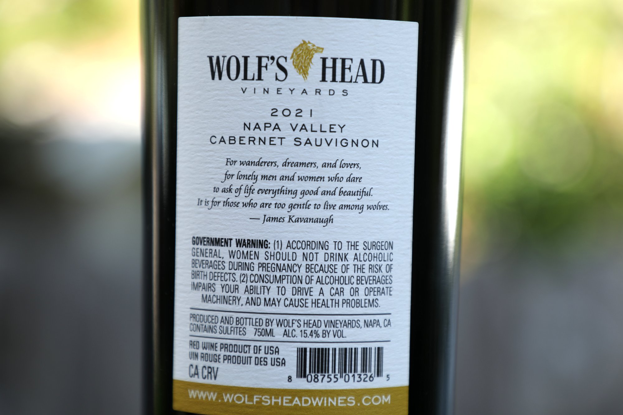 The 2021 Wolf’s Head Cabernet Sauvignon, Napa Valley is deep ruby and nearly opaque; this wine is a union between both ripe fruit and sweeter influences from its elevage in barrel. These scents include baked plums, cherry pie, blackberry jam, boysenberry spread, dark raspberry and strawberry. Other aromatic threads include sweet pipe tobacco, pencil shavings, dried herbs, mocha, cocoa powder, cinnamon, roasted coffee beans, milk chocolate, and Graham cracker. Ripe, yet also simultaneously bright, the palate tastes like dark cherry, blackberry, dark mulberry, boysenberry and dark plums, with underlying notes of dark cocoa powder, pipe tobacco, a light note of smoked cedar, sage and chalk. The tannins fully coat the palate with a firm and persistent handshake, holding on even after you are ready to let go. They linger with a drying, dusty and chalky character, far outpacing the fruit on the finish. This is a big boy, including its listed ABV of 15.4%.